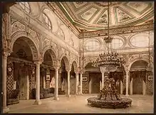 يتجلى التأثير الأوروبي في العمارة العامة للقصر. أعطيت الأولوية للطابق الأول، الذي أصبح من أهم أجنحة القصر، حيث يوجد فيه في نفس الوقت جناح الضيوف والغرف الخاصة بالباي. هذا التأثير يظهر بشكل كبير في الزخرفة الداخلية للغرف: كل الجدران مغطاة ببلاط الخزف المستورد بشكل رئيسي من إيطاليا، والرخام الأبيض المستورد من كرارا (إيطاليا)، الذي يمكن رؤيته في الأعمدة والتيجان وهياكل الأبواب والأرصفة. جميع اللوحات على السقوف هي أيضا من صنع إيطالي، وكذلك الأثاث والستائر والمفروشات، كما هو موضح بالصور والبطاقات البريدية في أوائل القرن العشرين.[2]
