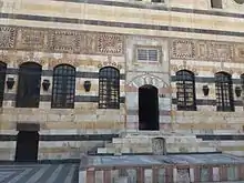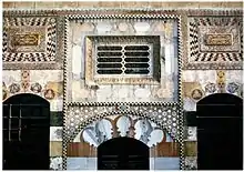 جميع واجهات المبنى تتكون من الحجر، تتألف من رضم بيضاء معاً مع رضم زهراء صهباء وسوداء اللون، ويوجد باب فخم يمكن الوصول إليه من سلمين متناظرين وتتزين جبهة قوس الباب بحجارة بيضاء وصهباء متعاشقة، تكتنفها من الأعلى خيوط وزخارف هندسية متشابكة تؤلف اطراً وتاجاً مستطيلاً، مرصوعة بالرخام والصدف اللامع. وتظهر فوق تاج الباب لوحة زينة كبيرة ذات اطار من أحجار ألوانها بيضاء وصهباء، تُحد بخيط رخامي أسود اللون، وفي الوسط إطار داخلي مزين بزخارف بارزة. تتوسط اللوحة بسملة وآية و4 أبيات شعر عربية موزعة على شطرين، كتبت بخط الثلث وبالذهب على خراطيش لازوردية، وهذه الأبيات:
