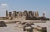 قصر تتشر أو قصر تجر أو كما يُطلَق عليه أيضاً بقصر داريوش[1] هو أحد أهم قصور الفترة الأخمينية والذي يقع ضمن منطقة تخت جمشيد التأريخية إحدى أهم المناطق الأثرية والسياحية في إيران بمدينة شيراز مركز محافظة فارس جنوب جمهورية إيران. وقد تم بناء قصر تجر تزامناً مع بناء قصر آبادانا، وقد كانت مكوناته من الحجر المصقول بغاية الدقة لدرجة أن الناس آنذاك أطلقوا عليه اسم "رواق المرايا" وقد استوطنه الملك واتخذه مقراً لإقامته. يُذكَر ان قصر تجر بُنيَّ بأمر الملك داريوش وأكمل بناؤه من بعده خشايار شاه، وإحدى مميزات هذا القصر هو احتوائه على كتابات ونقوش مسمارية مكتوبة باللغة الفارسية القديمة والبابلية والعيلامية.[2] يُذكَر ان برسبوليس (بالفارسية: تخت جمشيد) هي عاصمة الإمبراطورية الأخمينية (550-330ق.م). يبعد هذا الموقع مسافة 70 كم شمال شرق مدينة شيراز في محافظة فارس في إيران. في الفارسية الحديثة، يُعرَف هذا الموقع باسم تخت جمشيد (أي عرش جمشيد) أو پارسه. أقدم بقايا هذا الموقع يعود تأريخها إلى 515ق.م. يدعى هذا الموقع عند الفرس القدامى باسم پارسه، والتي تعني "مدينة الفرس". وترجمة اسم برسبوليس في اليونانية تعني "المدينة الفارسية". وقد تم إعلان تخت جمشيد كموقع للتراث العالمي من قبل اليونسكو. الأدلة الآثارية تثبت بأن أولى بقايا هذا الموقع قد تم إنشائها في عام 515ق.م. عالم الآثار الفرنسي، رينيه غودار، الذي قام بالتنقيب في الموقع في بداية العقد الرابع من القرن السابق، افترض أن قورش الكبير قام باختيار موقع تخت جمشيد، لكن دارا الأول هو من قام ببناء المصطبة والقصور العظيمة. قد أمر دارا الأول ببناء قصر آبادانا وقاعة المجلس (القاعة ذات الأبواب الثلاث)، وخزانة الدولة وما حولها. وقد تم إنهائها في عهد إبنه، الملك خشايار الأول. والعديد من المنشأت تم بنائها على نفس المصطبة إلى حين سقوط السلالة الأخمينية. لتخت جمشـيد أبنية تأريخية متبقّية من القصور الأخمينية، تعدادها ومسـاحاتها وارتفاعاتها المدهشـة وزخارفها ونقوشها الحجرية، مظاهر أضفت عليها شهرة عالمية فأصبحت إحدى آثار الحضارة الإنسانية. ومن القصور والأبنية المعروفة فيها هي بوّابة الأُمم، قصر آبادانا، قصر داريوش أو تجر، القصر ذو الأعمدة المائة، قصر أو بوّابة غير كاملة، خزانة تخت جمشيد، قاعة الشورى، بئر صخري، مقبرة أردشير الثاني والثالث، قصر هديش، القصر الداخلي الّذي هو الآن متحف تخت جمشيد.[3][4]