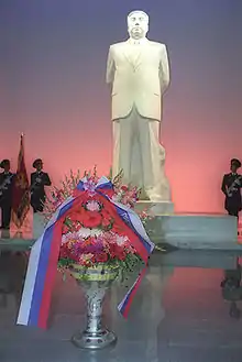 جسد الزعيم الأبدي بحكم الأمر الواقع دو فكتو، موجود داخل ناووس زجاجي، ورأسه موضوع على وسادة على نمط الكوري، وجسده مغطى بعلم حزب العمال الكوري (الحزب الشيوعي).