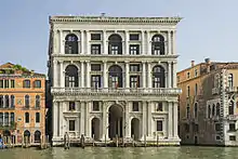 الخطة (plan) تنمو حول فناء مركزي بذوق كلاسيكي، اعجب به كثيراً اندريا بلاديو. واجهة البيضاء، مقسمة إلى ثلاث طبقات من النظام الكورينثي الأنيق، مستوحاة من العمارة الرومانية، إعادة موضوع بناء قوس النصر في كل طابق. الطابق الأرضي يبدو أقل إشراقا من الطوابق العليا، التي فيها يوجد سلسة من الأعمدة الكبيرة التي تفصل بين فتحات قوسية.