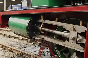 آلة بخارية ويرى قضيب الكباس بين المكبس (أخضر ، يسار) و رأس توصيل (يمين، صليبية الشكل).
