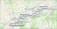 ويعبر القطار المعلق الطريق السريع للسيارات A46. وتستغرق رحلته من بداية الخط إلى نهايته نحو 30 دقيقة . [5] يتبع قطار فوبرتال المعلق شركة النقل العام "راين -روهر " .
