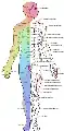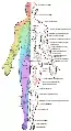 على طول منطقة الصدر والبطن القطاعات الجلدية تُشبه حزمة متشابكة من الأقراص مكونة الإنسان، كل منها تتغذى بعصب شوكي مُختلف. على طول الأذرع والأرجل يختلف الشكل، القطاعات الجلدية تسير طولياً على طول الأطراف. مع أن الشكل العام مُتماثل في جميع البشر، مناطق التعصيب الدقيقة تكون فريدة من نوعها للفرد كبصمات أصابعه.