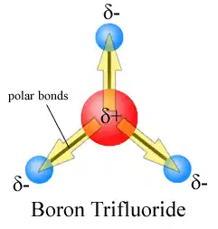 - مثال 5 في مركب ثلاثي فلوريد البورون توجد ثلاث روابط قطبية موزعة هذه الروابط على 120 درجة وبالتالي مجمل هذه الروابط لا يشكل ثنائية قطبية.