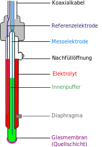 يتصل الالأنبوب الداخلي المحلول المراد قياسه عن طريق غشاء زجاجي، ويتصل الأنبوب الخارجي أيضا بسداد مسامي من السيراميك . ويتكون القضيب من السلسلة التالية الكهروكيميائية :