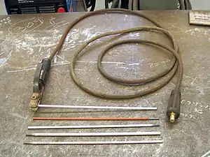 يستعمل لحام القوس الكهربائي قطبا لتوصيل التيار الكهربائي بين جزئين معدنيين للحامهما. ويوجد نوعان من تلك الأقطاب : نوع يُستهلك خلال عملية اللحام كما في قوس اللحام المعدني ونوع لا يـُستهلك كما في قوس لحام التنجستن. وعند اللحام بالتيار الكهربائي المستمر قد يشكل القطب المستخدم مصعدا أو مهبطا بحسب عملية اللحام المطلوبة. أما في حالة اللحام بالتيار المتردد فلا يعتبر قطب اللحام مصعدا أو مهبطا.