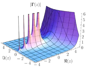 القيمة المطلقة لدالة غاما. هذا الشكل يشير إلى أن الدوال تؤول إلى ما لا نهاية له عند الأقطاب (اليسار). في اليمين، دالة غاما ليس لها أقطاب بل تتصاعد بوتيرة كبيرة.