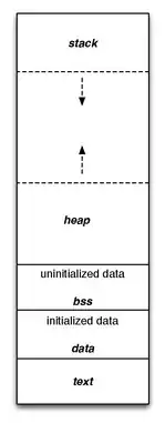 This shows the typical layout of a simple computer's program memory with the text, various data, and stack and heap sections.