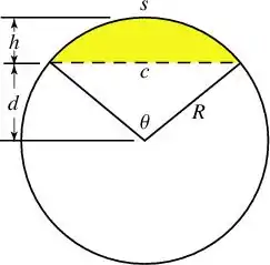 حيث R هو نصف قطر الدائرة، c طول الوتر، s طول القوس، h ارتفاع القطعة الدائرية، d ارتفاع الجزء المثلث، كما هو موضح بالشكل على اليسار.