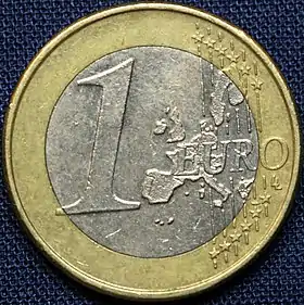 |CitationClass=تم تجاهله (مساعدة) - "1 euro coin". Wikipedia (باللغة الإنجليزية). 2019-11-14. مؤرشف من الأصل في 11 أبريل 2020. الوسيط