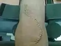 قطع عظم عند الركبة، وتُرى خياطة الجرح بالمشابك المعدنية.