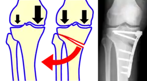خلال عملية قطع أعلى عظم الظنبوب (قصبة الساق)، يقوم الجراحون بإزالة جزء إسفيني من العظام (على شكل وتد) من الجزء الخارجي من الركبة، وهو ما يجعل الساق تنحني قليلا إلى الداخل. هذا يشبه إعادة تنظيم ركبة شخص متقوس القدمين للداخل لتصبح ركبة روحاء تميل إلى الخارج. بعد العملية، ينتقل وزن المريض إلى الجزء الخارجي (الوحشي) من الركبة حيث يكون الغضروف لا يزال بحالة جيدة وليس تالفاً.