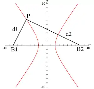 حيث c هو أقصر مسافة من نقطة الأصل إلى البؤرة B2