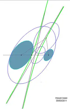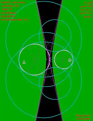 - كمحل هندسي لمراكز الدوائر الماسة دائرتين معلومتين Θ Δ، في الظروف التي تكون فيها تلك الدائرتين Θ Δ متقاطعتين أو خارجتين عن بعضهما البعض (اي ان لا تكون الواحدة داخل الأخرى) وان يكون مختلف نصف قطرهما. في الحالة التي يكون فيها تساوي بين الدائرتين Θ Δ, المحل الهندسي الناتج يكون مكون من نقاط تنتمي إلى خط مستقيم الذي ينطبق مع محور تماثل الدائرتين.