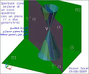 - عن طريق قطع مخروط دوراني K بمستوى موازي لاثنين من راسمين سطح K.