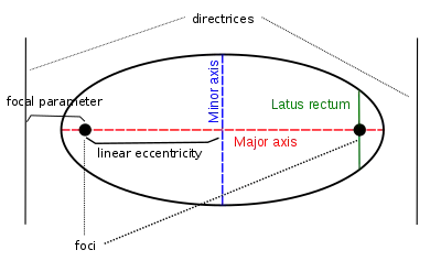 بالإضافة إلى الاختلاف المركزي (e)، والبؤر، والدليل ، ترتبط العديد من الميزات والأطوال الهندسية بقطع مخروطي.