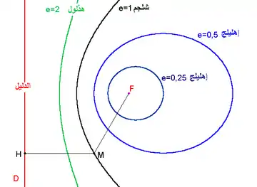 - إذا كان الاختلاف المركزي يساوي ھ وكانت البؤرة عند نقطة الأصل (0،0) والدليل مستقيما عموديا على محور السينات يقطعه على بعد ف فإن معادلة القطع المخروطي تعطى بالمعادلة التالية: