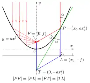 وبالتالي للقطع المكافئ الذي على الصورة f(x)=x²، المعامل a يساوي 1، وبالتالي فإن النقطة البؤرية F هي (0,¼)