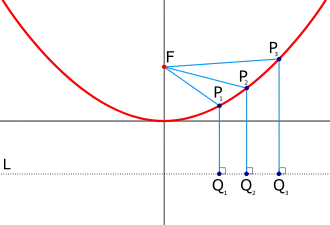أي خط FP يصل بين البؤرة وأي نقطة على القطع المكافئ يتساوى في الطول مع أي خط QP مرسوم عموديًا من هذه النقطة الواقعة على القطع المكافئ إلى الدليل ويقطعه في النقطة Q.
