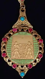 القلادة من الذهب الخالص، وتتمثل في سلسلة تتجسد في وحدات متشابكة تمثل رسوما فرعونية تدل علي الخير والنماء التي يجلبها النيل للبلاد، وما بين كل وحدة وأخرى زهرات من الذهب، وجميعها مرصعة بالميناء من فصوص من الياقوت الأحمر والفيروز الأزرق، وهي أعلي الأوسمة في مصر.[1]