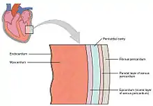 يتألف جدار القلب من ثلاث طبقات: الداخلية وهي الشِّغاف، والوسطى وهي عضلة القلب، والخارجية وهي النِّخاب. تُحاط هذه الطبقات الثلاث بكيس ثنائي الغشاء هو التامور.