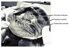 تمتد العضلات الحليمية من جدران القلب إلى الصمامات عبر اتصالات غضروفية تُدعى الحبال الوترية. تمنع هذه العضلات الصمامات من الرجوع إلى الخلف كثيراً عند انغلاقها.[22] أثناء الطور الانبساطي من الدورة القلبية، تكون العضلات الحليمية منبسطة أيضاً، وعندما تنقبض حجرات القلب، تنقبض كذلك العضلات الحليمية، يخلق هذا ضغطاً على الحبال الوترية يساعد في الإبقاء على وريقات الصمّامات في مكانها ويمنعها من أن تنقلب إلى الأذينين.[7] [lower-alpha 1][20]