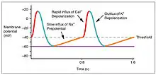 عندما تستريح خلايا العقدة الجيبية الأذينية يكون لها شحنة سلبية على أغشيتها، إلا أن تدفّقاً سريعاً لأيونات الصوديوم سيؤدي لشحن الغشاء بشحنة موجبة، تُدعى هذه الظاهرة بزوال الاستقطاب وتحدث بشكل عفوي.[7] وعندما تصبح الخلايا مشحونة بشكل كبير تنغلق قنوات الصوديوم وتبدأ شوارد الكالسيوم بالدخول إلى الخلية وبعدها بوقت قصير تبدأ شوارد البوتاسيوم مغادرة الخلية. تنتقل جميع هذه الشوارد عبر قنوات شاردية في غشاء خلايا العقدة الجيبية الأذينية. تبدأ حركة شوارد البوتاسيوم والكالسيوم عندما تصبح الخلية مشحونة بشكل كبير، وتدعى قنوات الكالسيوم ببوابات الفولطاج، بعد بدأ حركة الكالسيوم بقليل تنغلق قنوات الكالسيوم وتنفتح قنوات البوتاسيوم لتسمح للبوتاسيوم بترك الخلية. يؤدي هذا إلى امتلاك الخلية لشحنة سلبية أثناء الراحة، وتُدعى هذه العملية بإعادة الاستقطاب. وعندما يصل كامن الغشاء إلى -60 ميللي فولط تقريباً، تنغلق قنوات البوتاسيوم وتبدأ العملية مرة أخرى من جديد.[7]