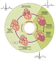 يشير مصطلح الدورة القلبية إلى ضربة قلبية كاملة تتضمن انقباض وانبساط والتوقف.[9] تبدأ الدورة بتقلّص الأذينين وتنتهي باسترخاء البطينين. يشير مصطلح الانقباض إلى تقلُّص البطينين. أمَّا مصطلح الانبساط فيشير إلى استرخاء البطينين وامتلاءهما بالدم. يعمل الأذينان والبطينان بانسجام واضح، حيث أنه عند الانقباض حيث يتقلّص البطينان، يسترخي الأذينان ويمتلئان بالدم. أما في الانبساط حيث يسترخي البطينان يتقلَّص الأذينان ليضخّا الدم إلى البطينين. يضمن هذا التناسق ضخّ الدم بفعالية إلى مختلف أنحاء الجسم.[7]