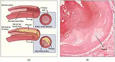 مرض الشريان التاجي، يُعرف كذلك باسم مرض نقص تروية القلب، سببه تصلُّب شرايين-تراكم لويحة على طول الجدران الداخلية للشرايين، مما يؤدي لتضيُّقها، وبالتالي يقلُّ تدفُّق الدم إلى القلب.[50] قد تسبب اللويحة المستقرة ألم صدريّ (ذبحة) أو ضيق تنفُّس خلال التمارين أو أثناء الراحة، وقد لا تُسبِّب أعراضاً على الإطلاق. قد تُسبب اللويحة المتمزقة إحصاراً في وعاءٍ دموي وقد تؤدي إلى احتشاء في عضلة القلب، تُسبِّب ذبحةً غير مستقرة أو نوبة قلبية.[51] في أسوأ الأحوال قد تحدث سكتة قلبية-فقدان مفاجئ وتام لنتاج القلب.[52] يمكن لعوامل السمنة وارتفاع الضغط الدموي والسكري غير المضبوط والتدخين وارتفاع الكوليسترول أن تزيد من خطر الإصابة بتصلب الشرايين ومرض الشريان التاجي.[48][50]