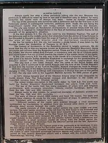 - "The Citadel of Alanya". Alanya Municipal Government. 2002. مؤرشف من الأصل في 22 يوليو 2011. اطلع عليه بتاريخ 16 يونيو 2011. الوسيط