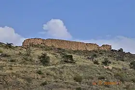 تحيط بالمساحة الخارجية للقلعة أسوار ذات تعرجات وتقوسات فرضتها ظروف الموقع وتضاريسه٬ ويبلغ طول السور الشرقي شمالاً 96.5 متر٬ ويوجد وسطه برج نصف دائري لتدعيمه من جهة٬ وللاستفادة منه بوصفه عنصرًا دفاعيًا من جهة أخرى. أما السور الغربي فيبلغ طوله شمالاً 94 متر، ويبلغ سمك هذه الأسوار 1.2 متر٬ وقد انخفض ارتفاعها نظرًا إلى تهدم أجزائها العليا. يوجد في جدران الأسوار فتحات من أعلى بأبعاد مختلفة، من الداخل (30×30سم) ومن الخارج (30×10سم). واستغل معمار القلعة الموقعين المتقدمين في الجهتين الشمالية الغربية والجنوبية اللذين يشرفان على منحدرين صعبي الارتقاء في تشييد منظرتين استُغلت في بنائهما الصخور الكبيرة. ففي الشمال الغربي استُغل وجود ثلاث كتل صخرية كبيرة فعُمد إلى بناء جدران بين هذه الكتل الصخرية مكونة برجًا مضلعًا٬ كما فتحت في الحوائط فتحات للتصويب بالمدافع الثقيلة في ثلاثة اتجاهات.