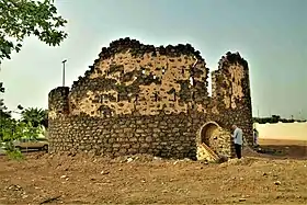 بنيت القلعة من الحجر الأسود ذي المقاسات والأحجام المختلفة، وقد جلبت تلك الأحجار من الجبال والمحاجر القريبة منها. تتكون القلعة بوجه عام من برجين دائريين متداخليين، البرج الأكبر هو برج القلعة الرئيسي، ويبلغ طول قطره من الداخل 13متر و20 سم، ويحيط بهذا البرج الأكبر من الداخل 10 عقود حجرية تحيط بجدار القلعة من الداخل والتي كونت بدروها مع جدار القلعة دعامات أو أساسات ترتفع عليها الأجزاء العليا ومن جدران القلعة، ويتوسط فراغ هذه القلعة فناء أو ساحة مفتوحة، ويوجد درج يؤدي إلى سطح دوران القلعة أو سطح البرج الأصغر.