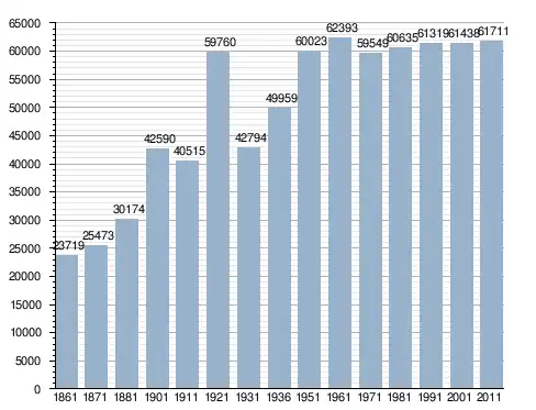 في سنة 1861 بلغ عدد السكان 23٬719 نسمة، وتطور العدد ليصل في سنة 2011 لـ 61٬711 نسمة.