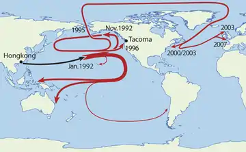 حوادث أخرى حدثت أيضا أفادت في تتبع التيارات البحرية كما حدث مع ناقلة هانزا عندما أسقطت 21 حاوية في البحار تحتوي على أحذية نايكي.