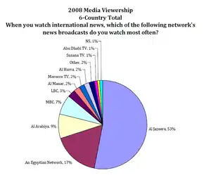 بحسب استطلاع رأي قامت به مؤسسة زغبي فإن 9% يتابعون قناة العربية كمصدر أول للأخبار في أغلب الأحيان، مقابل 53% لقناة الجزيرة.