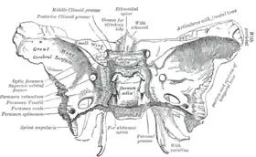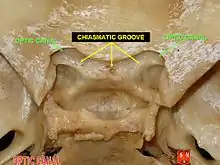 السطح العلوي للعظم الوتدي محاط من الخلف بحافة، بيحث أنها تشكل الحافة الأمامية ل ثلم (إخدود) ضيق، مستعرض، يسمى الثلم التصالبي (الثلم البصري)، من فوق والخلف حيث يقع التصالبة البصرية ؛ الثلم البصري ينتهي على كلا الجانبيين للثقبة البصرية، الذي ينقل العصب البصري والشريان العيني (مع الألياف العصبية السمبثاوية الودية المرافقة) إلى جوف الحجاج (التجويف المداري).