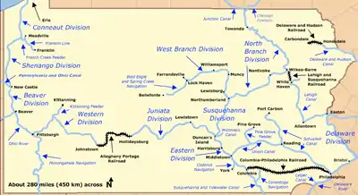 خريطة قنوات بنسلفانيا التاريخية و السكك الحديدية التي تربط مع بعضها