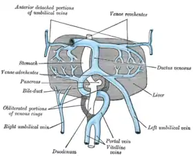 ![]() في الدوران الجنيني، القناة الوريدية (بالأحمر) تصل بين الوريد السري والوريد الأجوف السفلي. | |