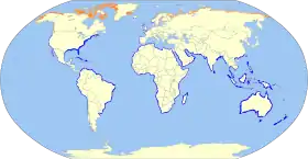 في الأمريكتين، تمضي الأنواع فصول الشتاء على السواحل الممتدة من واشنطن وماساتشوستس جنوبًا حتى الطرف الجنوبي لأمريكا الجنوبية رغم أنها نادرة في الأجزاء الجنوبية من تشيلي والأرجنتين، وهي تجول بشكل غير مؤكد في جزر فوكلاند. في أوروبا، تمضي الطيور فصول الشتاء في المناطق الغربية من آيسلندا والنرويج والدنمارك جنوبًا. توجد أعداد صغيرة فقط على سواحل البحر المتوسط. في إفريقيا، تُعد شائعة الوجود في جنوب إفريقيا بأعداد كبيرة في العديد من الجزر البحرية. في آسيا، تنتشر الطيور في الجنوب وتمضي الشتاء في أقصى الشمال حتى جنوب الصين واليابان (بشكل رئيسي في جزر ريوكيو). توجد أيضًا في جنوب تاسمانيا ونيوزيلندا وفي العديد من جزر المحيط الهادئ. تبقى بعض الطيور غير المتكاثرة على مدار السنة في أجزاء كثيرة من النطاق الشتوي.