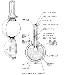 احتاجت القنبلة إلى تأخير حتى يتم التخلص من القاذفة، لذلك كان الجورب المصنوع من الصوف مغطى بمادة لزجة لضمان بقاء القنبلة في مكانها لبضع ثوان قبل التفجير. [2] بعد تغطية القنبلة بالغراء، كان من الضروري استخدام مقبض غير لاصق. في المقبض، تم إشعال فتيل التأخير عن طريق إطلاق رافعة ذات نوابض بحيث بدأ تأخير زمني لمدة خمس ثوانٍ حيث تركت القنبلة يد القاذف (تمامًا مثل الرافعات الموجودة في قنبلة يدوية من نوع ميلز). [2]