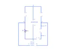 والمقاومات العيارية R2 ، R1 توصل إلى الأطراف 13 - 14، على الترتيب. والمقاومة المجهولة RX توصل إلى الأطراف 9 - 10، كما يوصل سلك سميك يمثل كوبري على الأطراف 5-6، ولقياس التيار المستمر توصل بطارية إلى الأطراف 14 - 13، وميكروأميتر للأطراف 12 - 11.