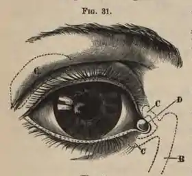![]() القناتان الدمعيتان العليا والسفلى مرسومتان على يمين الصورة (موسومتان بحرف C). الجزء الموسوم بحرف "D" هو اللحيمة الدمعية، والحرف "B" هو كيس الدمع. رسم في عام 1884م. | |
