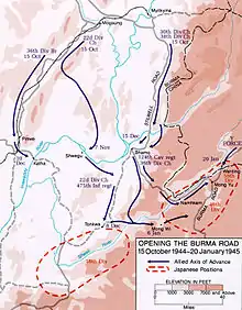 تقدمت الفرقة الثالثة والثلاثون البريطانية، علي الجبهة اليمني من القيادة، جنوبا أسفل وادي السكك الحديدية، من موجاونج إلي إنداو. في 10 ديسمبر 1944، أجريت اتصالات مع الفرقة التاسعة عشر الهندية بالقرب من إنداو. وأصبح للجيش الرابع عشر و NCAC الآن جبهة مستمرة.