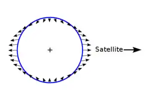 لنعتبر الآن أن التسارع ناتج عن كتلة كروية M تخضع لجسم صغير قريب ذو كتلة m وR هي المسافة بين مركز M وm ولتكن ∆r هي المسافة التي يبعدها الجزيء الخارجي للجسم m وللتبسيط نعتبر أن الجزيء الذي يبعد ∆r هو أول ما يتأثر بالجسم M. فإذا ما كان الجسم m كروي وبنصف قطر ∆r عندها يعتبر هذه الجزئ واقع على سطح هذا الجسم وسيقع على مسافة (R ± ∆r) من مركز الجسم M وبالتالي سيصبح القانون: