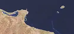 صورة فضائية لأرخبيل قورية قرب مدينة المنستير (على اليسار)
