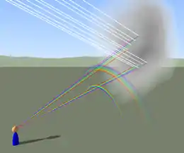 في البداية ينكسر ضوء الشمس الساقط بشكل مائل عند دخوله في قطرات المطر ومن ثم ينعكس مرة أخرى في السطح الداخلي من القطرة وينكسر أيضا عند خروجه من القطرة. يظهر التأثير الكلي في الضوء الساقط منعكسا على مدى واسع من الزوايا، مع تركيز شديد له في زاوية 40°–42°. يمكن اثبات أن هذه الزاوية مستقلة عن حجم القطرة، ولكنها تعتمد على معامل الانكسار. يمتلك ماء البحر معامل انكسار أعلى من ماء المطر، لذا يكون نصف قطر قوس قزح في المرشات البحرية أصغر من القوس الحقيقي. يكون هذا مرئيا للعين المجردة على هيئة عدم استقامة بين هذين القوسين.[1]