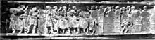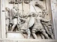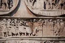 في الجُزء العُلوي مِن كُل عَمود، يُمكن رُؤية المَنحوتات الكَبيرة التي تُمثِّل ال"داسيا"، وهي من تاريخ تراجان، تَقع فَوق المَمَر المَركزي، كما أنَّ تَشكيل الجُزء الأكثر بروزاً من العِليّة مُتَطابِقة عَلى كِلا الجانِبَين من القَوس. حَيثُ أنَّ النَّقوش تَشمَل أربَعة أزواج من لَوحات الإغاثَة فَوقَ المَمَرات الصَغيرة، وهي ثَمانِيَة في المَجموع. مَأخوذَة مِن نَصب مَجهول أُقيمَ تَكريماً لِماركوس اوريليوس على الجانِب الشَّمالي، مِنَ اليَسار إلى اليَمين لَوحات تُصَور عَودَة الإمبراطور إلى روما بَعد الحَملة (المُغامَرة)، ومُغادَرَة الإمبراطور للمَدينة وحيَّاً بِتَجسيد فلامينيا، وإمبراطور تَوزيع المال بين الناس (لارغيتيو)، وإمبراطور استِجواب سَجين المانية. أمَّا على الجانب الجَنوبي، مِنَ اليَسار إلى اليَمين، يُصَور القَبض على زَعيم العَدو الذي قاد ضد الإمبراطور، وهُوَ مَشهد مُماثِل للسُّجناء الآخرين كما يَتضح أدناه، والإمبراطور الذي يتحدث إلى القوات، وإمبراطور التَّضحية بالخنزير والأغنام والثور (سوفيتورليا) مَع ثَلاثَة لَوحات مَوجودة الآن في مَتحف كابولين، ورُبما أُخذت الإغاثة مِن نَصب تِذكاري للاحتفال بِذِكرى ماركوس اوريليوس في الحرب ضِدَّ الماركواني والسارماتيين ما بين (169-175)، التي انتَهَت مَع عَودَة ماركوس اوريليوس المظفرة في عام176. وفي لَوحَة لارغيتيو، تَمَّ القَضاء على الرَّقم الخاص بإبن ماركوس اوريليوس ' كومودوس ' بَعدَ تَخليد ذِكرى دامناتيا.