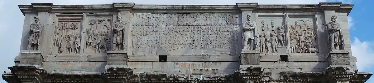 votis x — votis xx sic x — sic xx تعطي تلميحاً على تاريخ القوس: "التعهدات الرسمية للذكرى العاشرة--للذكري العشرين" و "بالنسبة لل 10th ، وذلك للذكرى 20". وكلاهما يشير إلى ديكاناليا قسطنطين، أي الذكرى العاشرة لحكمه (محسوب من 306)، الذي احتفلت به في روما في صيف 315. ويمكن افتراض أن القوس جاء تكريماً لانتصاره.