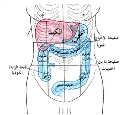 ![]() الواجهة الأمامية للبطن، وتظهر العلامات السطحية للكبد، والمعدة، والقولون. الواجهة الأمامية للبطن، وتظهر العلامات السطحية للكبد، والمعدة، والقولون. | |
